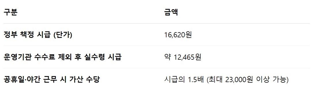 📌 운영기관 수수료는 기관마다 다르며, 보통 20~25% 수준입니다. 즉, 이론상 시급은 16,620원이지만 실제 손에 들어오는 금액은 약 12,000원 대예요.